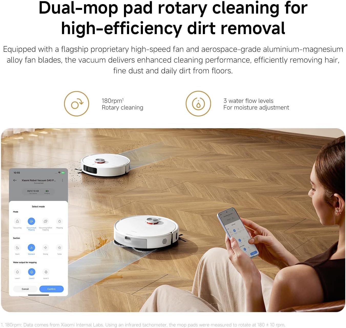 Xiaomi S40 Pro Robot Vacuum delivers next-level cleaning performance with powerful 4000Pa suction and intelligent navigation technology. Equipped with advanced LDS LiDAR mapping, it scans and plans your home layout in real-time to ensure full coverage and precise cleaning paths.