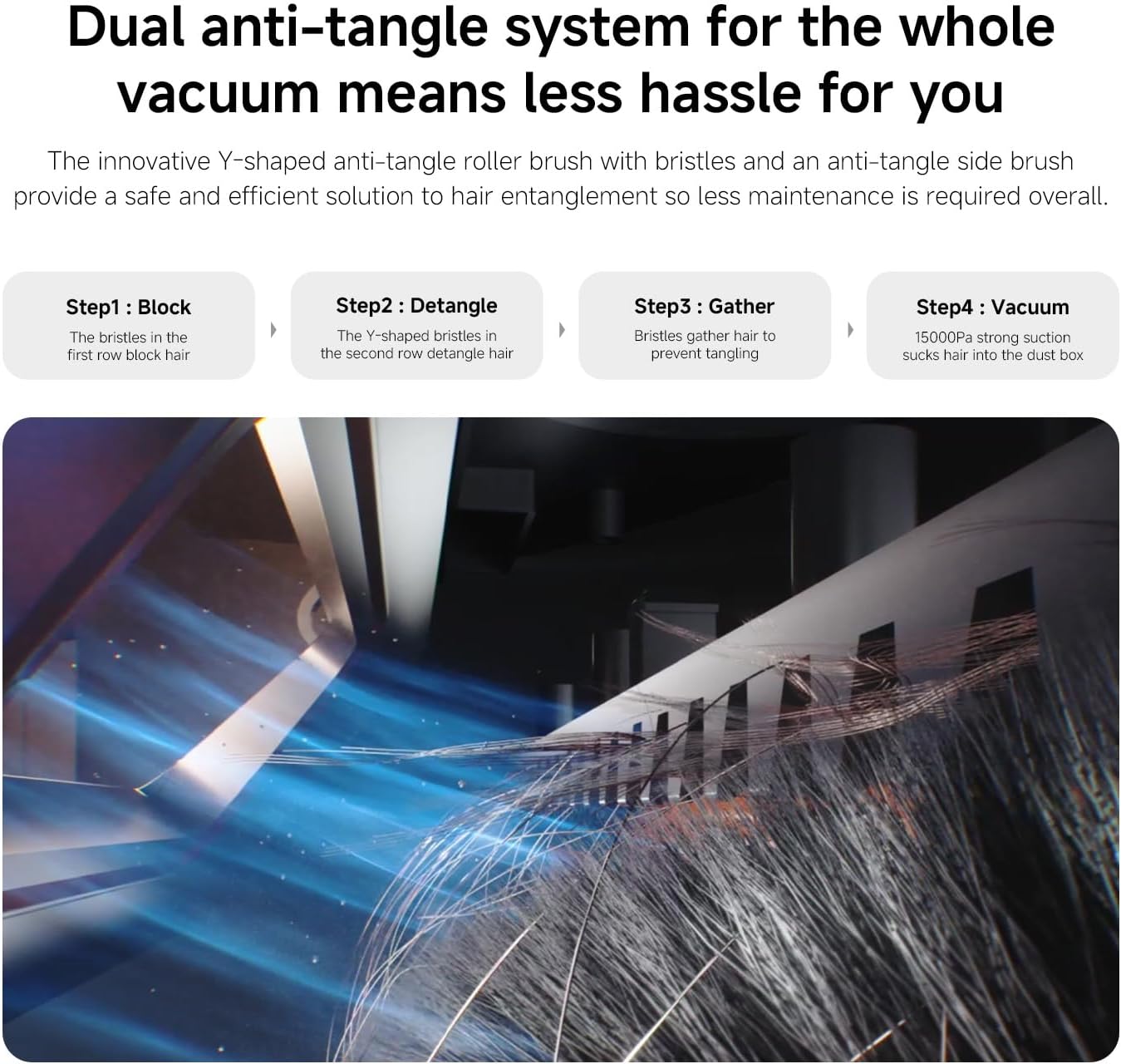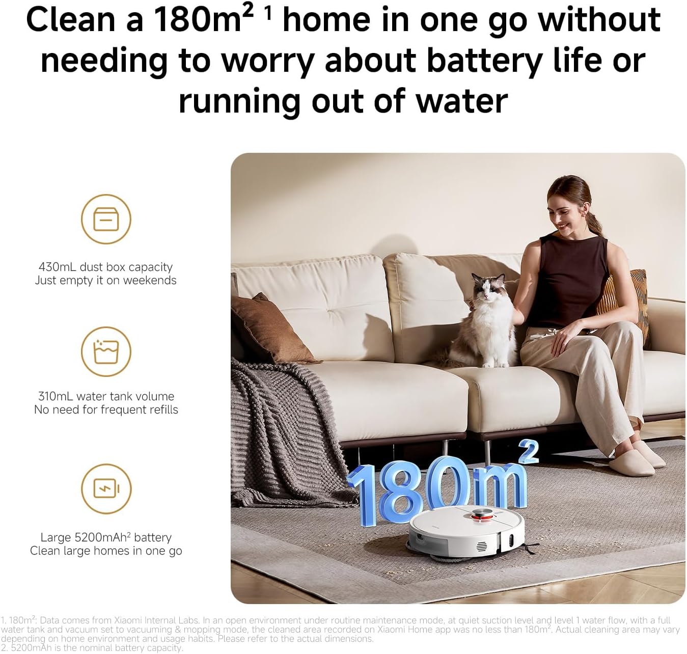 Powered by a high-capacity 5200mAh battery, the S40 Pro runs up to 180 minutes on a single charge and automatically returns to its dock when low. The slim 9.6cm design easily fits under furniture, and the quiet motor ensures a comfortable cleaning experience.